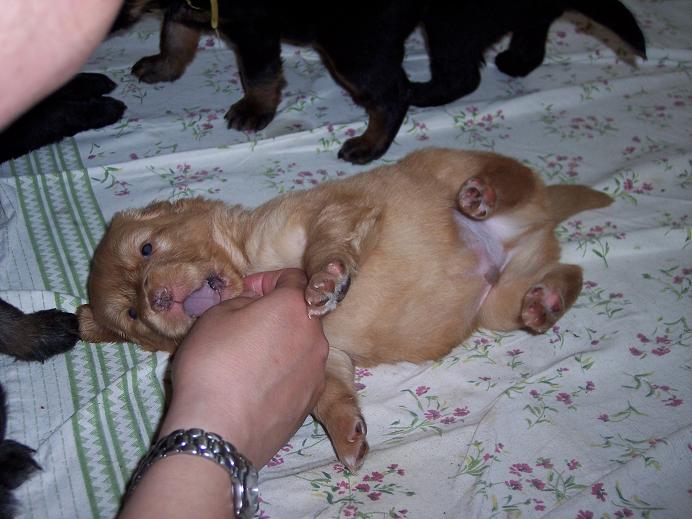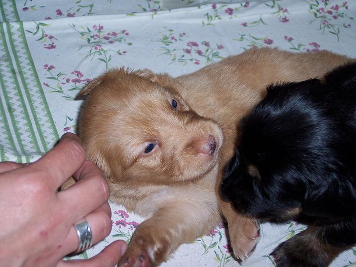 Začalo ťuťu ňuňu… no takových už tady pár bylo, takže jsem se vůbec nevzrušoval a dál si válel šunčičky napasovaný mezi bráchama. Ale pak mi došlo, že tihle dva asi přijeli za mnou a že to jsou moji budoucí páníčkové – tož jsem se jal odstrkovat Henrietu, která se k mojí paničce začala hned od začátku lísat. Žďuchnul jsem do Rity, aby věděla, že tohle je MOJE panička a pro jistotu jsem paničce hned ožužlal čenich. Páníček se na mě všelijak pitvořil, aby upoutal mou pozornost, tak jsem se od něj milostivě taky nechal pochovat.